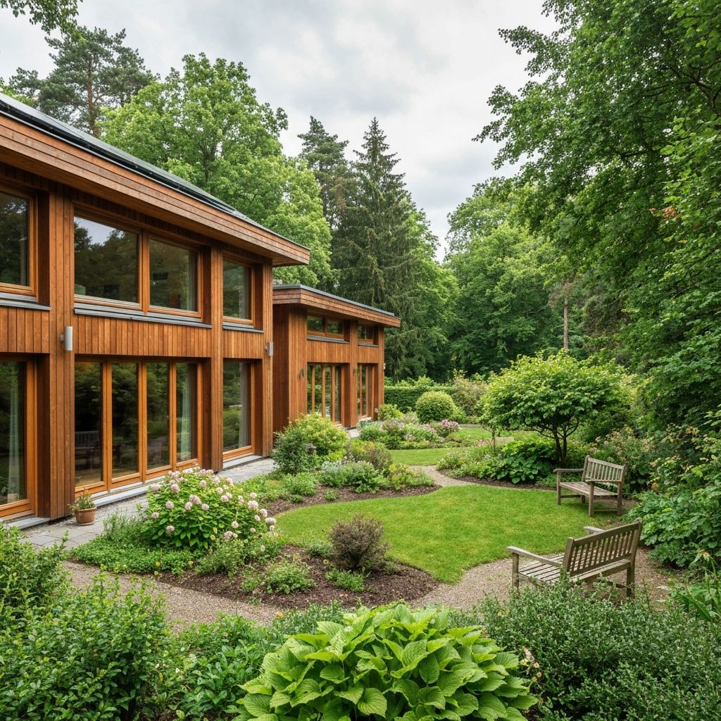 Модерни, енергетски ефикасни домови изградени од природни материјали со фокус на одржливост.